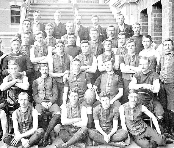 The Melbourne Football Team. The men are wearing lace-up football guernseys and poses in front of stairs.