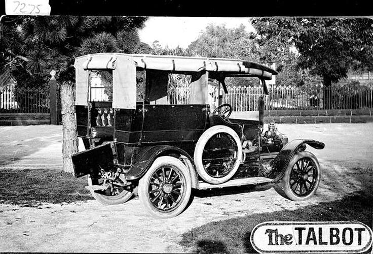 A Talbot passenger car. Passenger entry is from the rear and the door is open. Kellow Motors of Russell Street, Melbourne held the agency for Talbot cars at this time.
