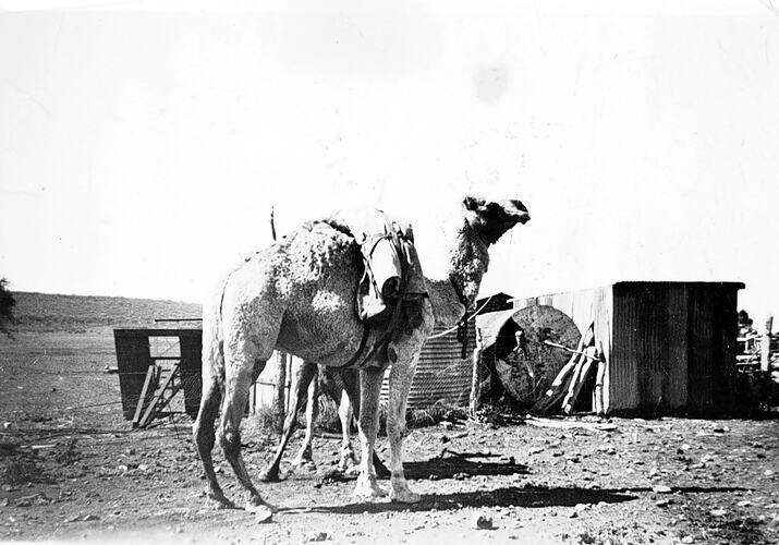 A camel carrying a pack at "Nonning" sheep station, South Australia. There are water tanks in the background. Dated to circa 1938.
