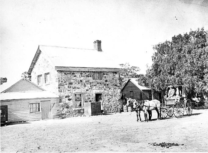 The farm house on 'Walmer' farm. The farm house is built of stone. There is a horse-drawn carriage on the left.
