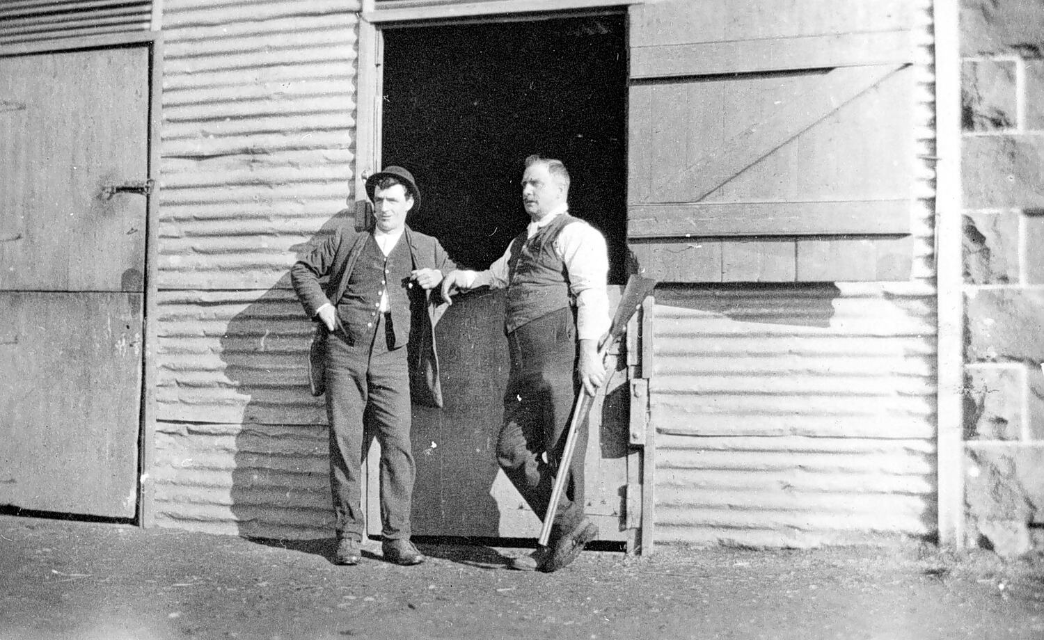 Two men, one holding a gun, by a building on 'Borriyallock' station.