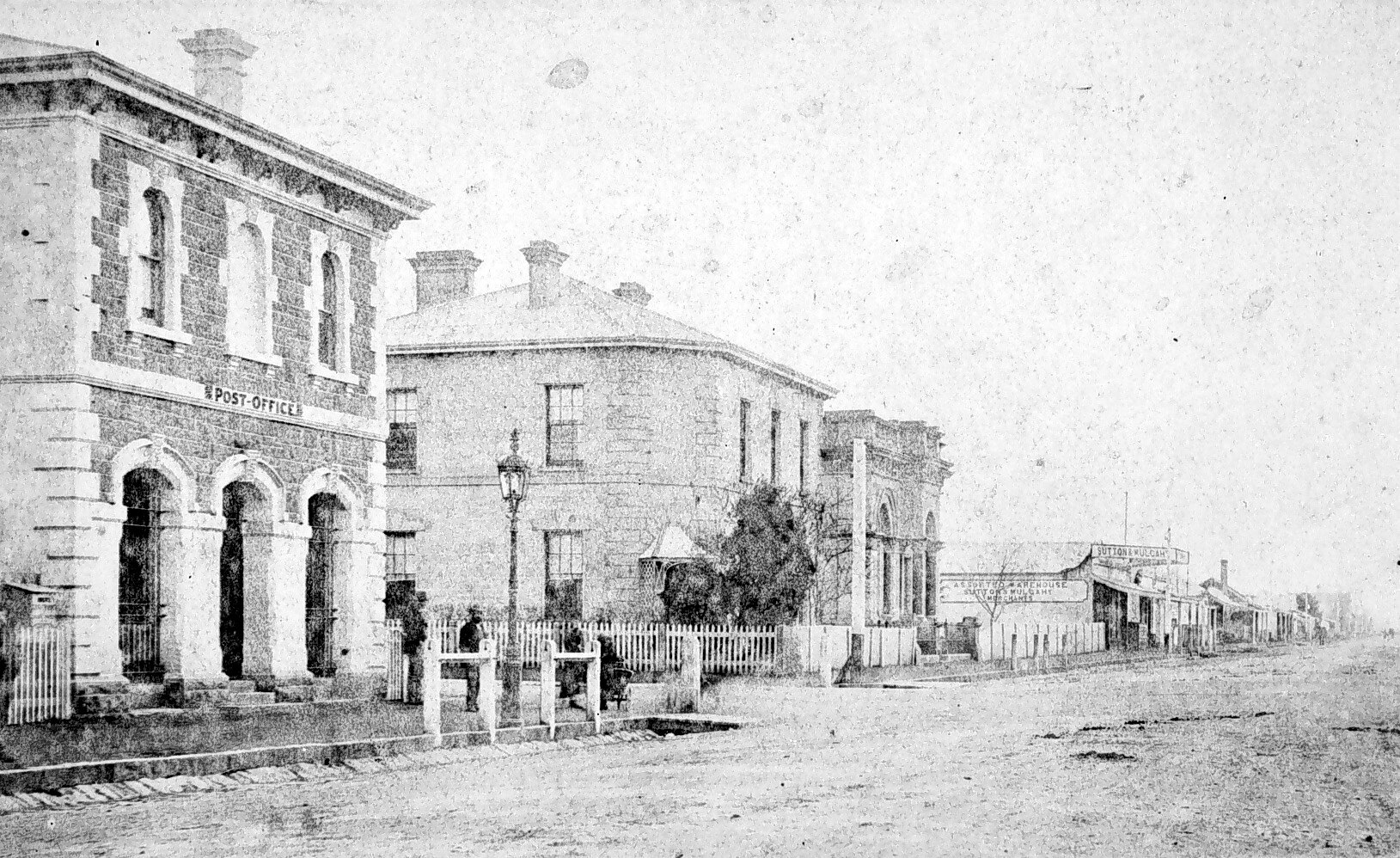 Looking down a street with the post office on the left and Sutton & Mulcahy, Merchants in the background.