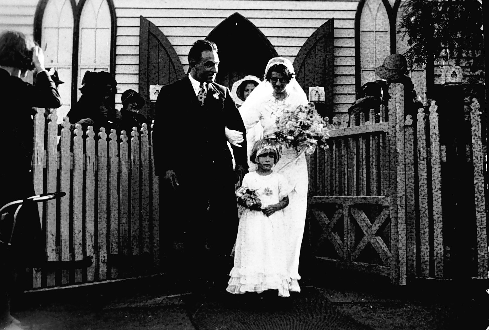 Bride and groom leaving the church. There is a flower girl in front of them.