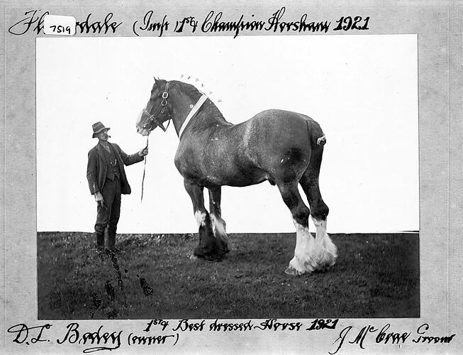 Hand written in black ink above photograph: "Flowerdale (Imp 1st Champion Horsham 1921" Hand written in black ink below photograph: "1st Best dressed Horse 1921 / D.L. Bodey (owner) J McCrae Groom"