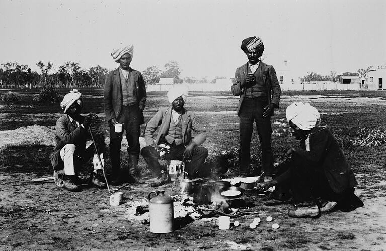 A group of Indians cooking a meal. The 'Leader' office is in the background.