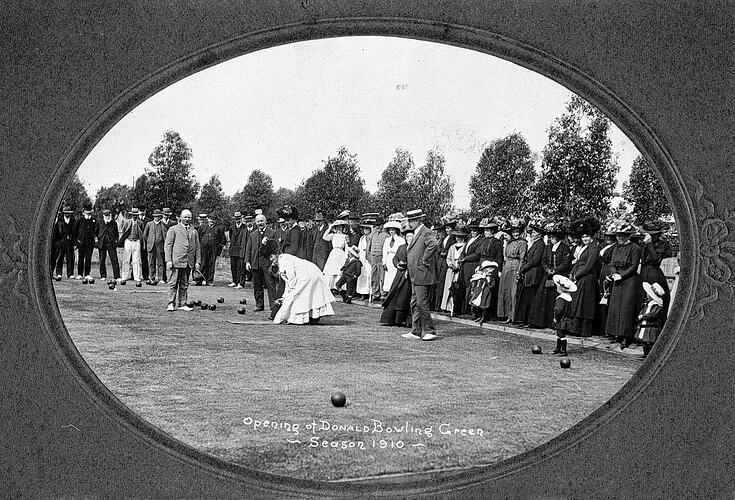 Crowds watching a woman deliver the first bowl at the opening of the Donald Bowling Green.
