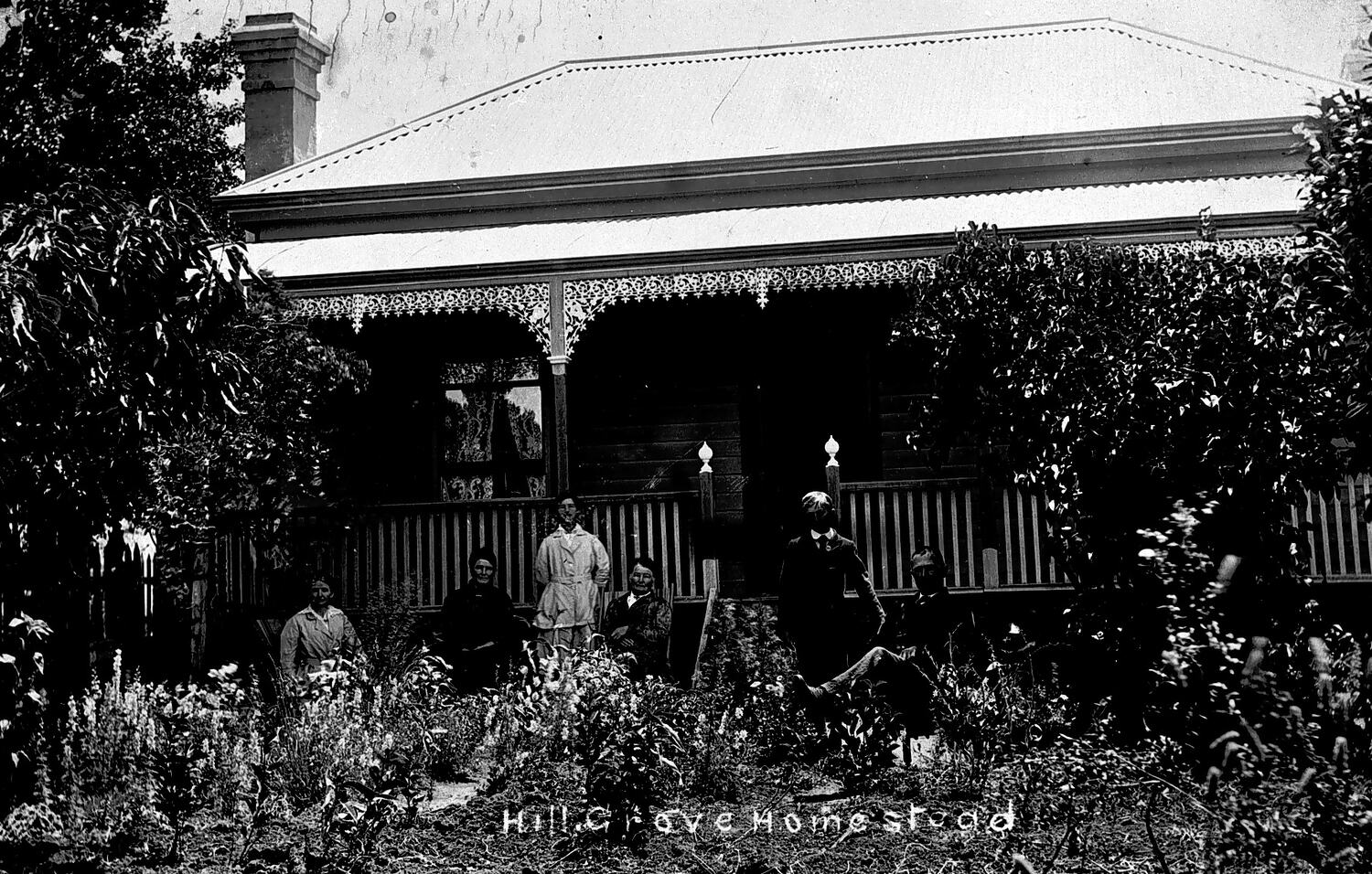 A group of people standing in front of the homestead on 'Hillgrove' station.