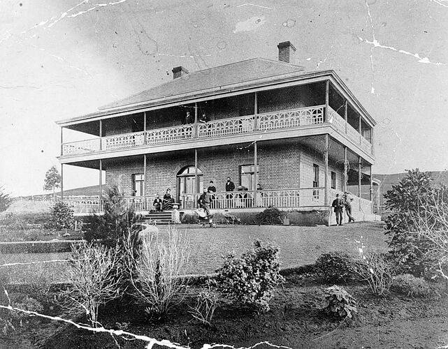 People on the verandas of 'Nangeela' homestead. The house has two stories and verandas on both levels.