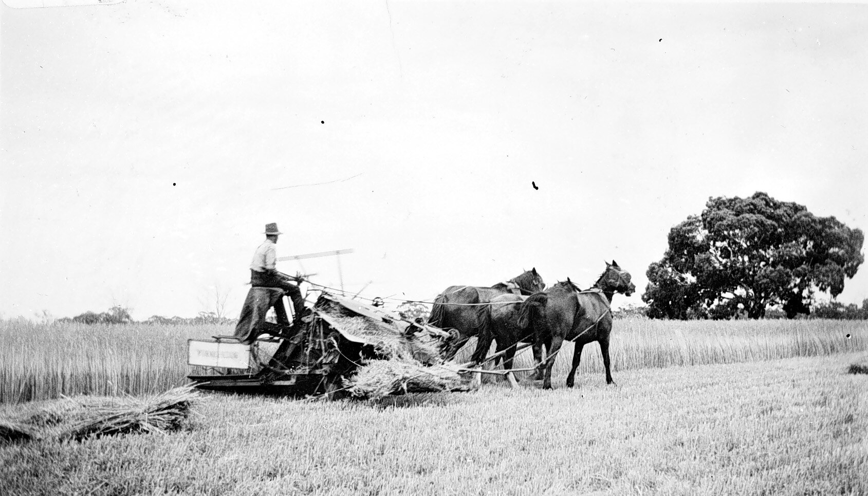 Harvesting a crop with a horse-drawn reaper-binder.