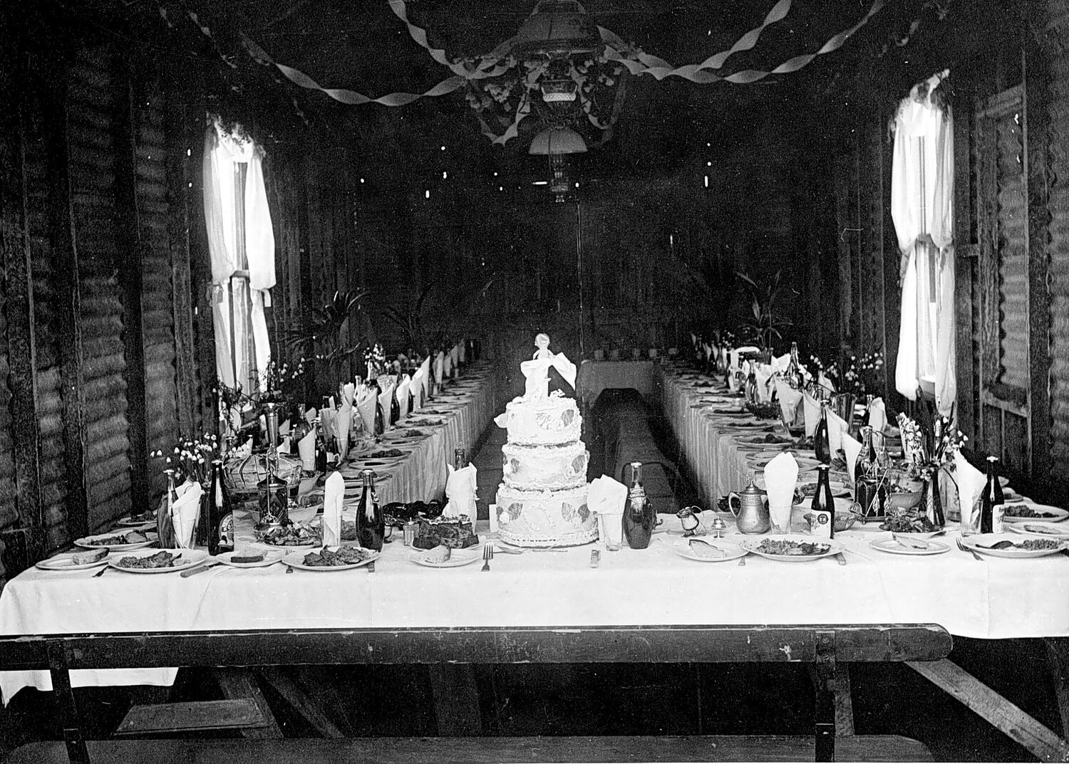 Tables set for a wedding reception. The building appears to be constructed from corrugated iron with no inner lining.