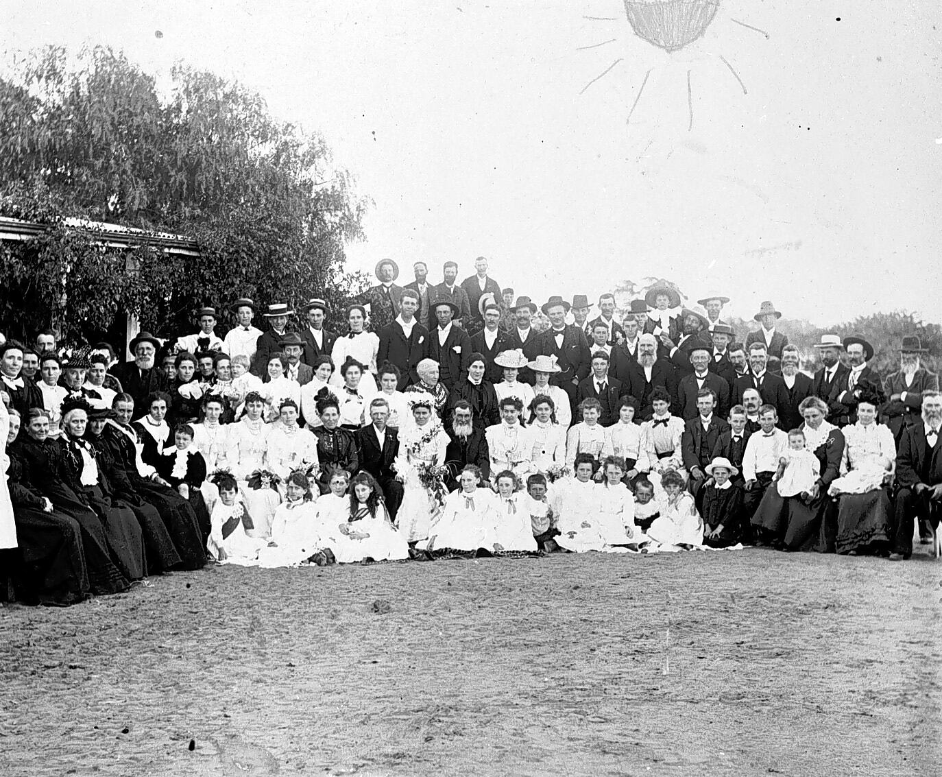 A large wedding group. A sun has been drawn in at the top of the photograph.