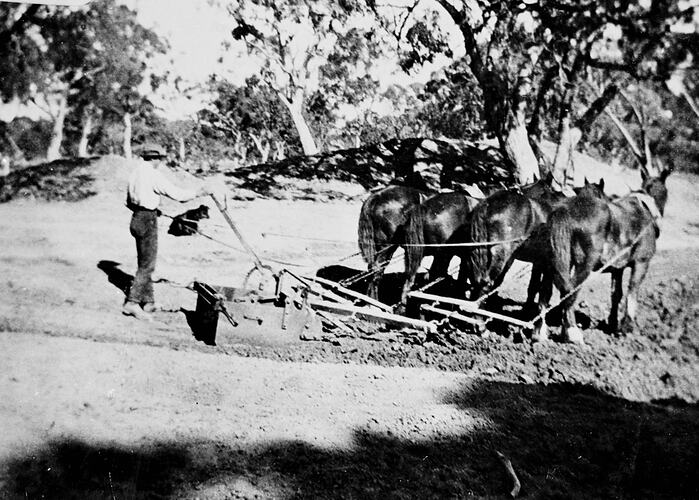 Black and white negative of a man using a four horse-drawn scoop to excavate a windmill dam at Ashens, via Murtoa, Victoria, 1925.