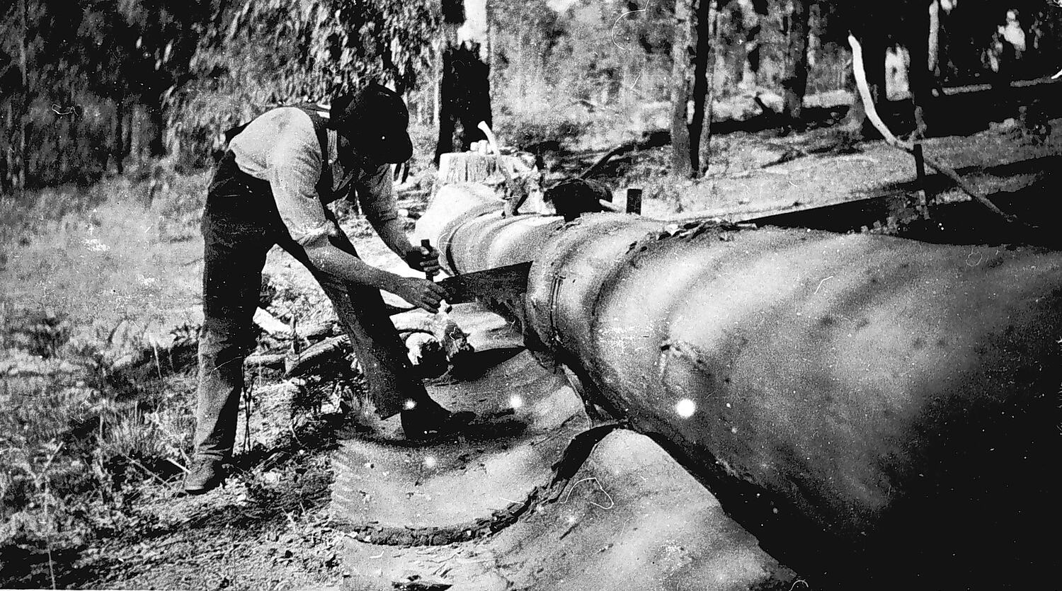 A man sawing a large log. He has peeled the bark off the log.