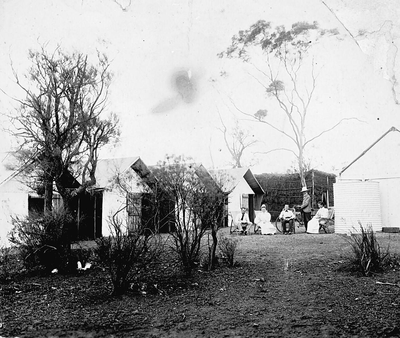 A group sitting among bush huts.