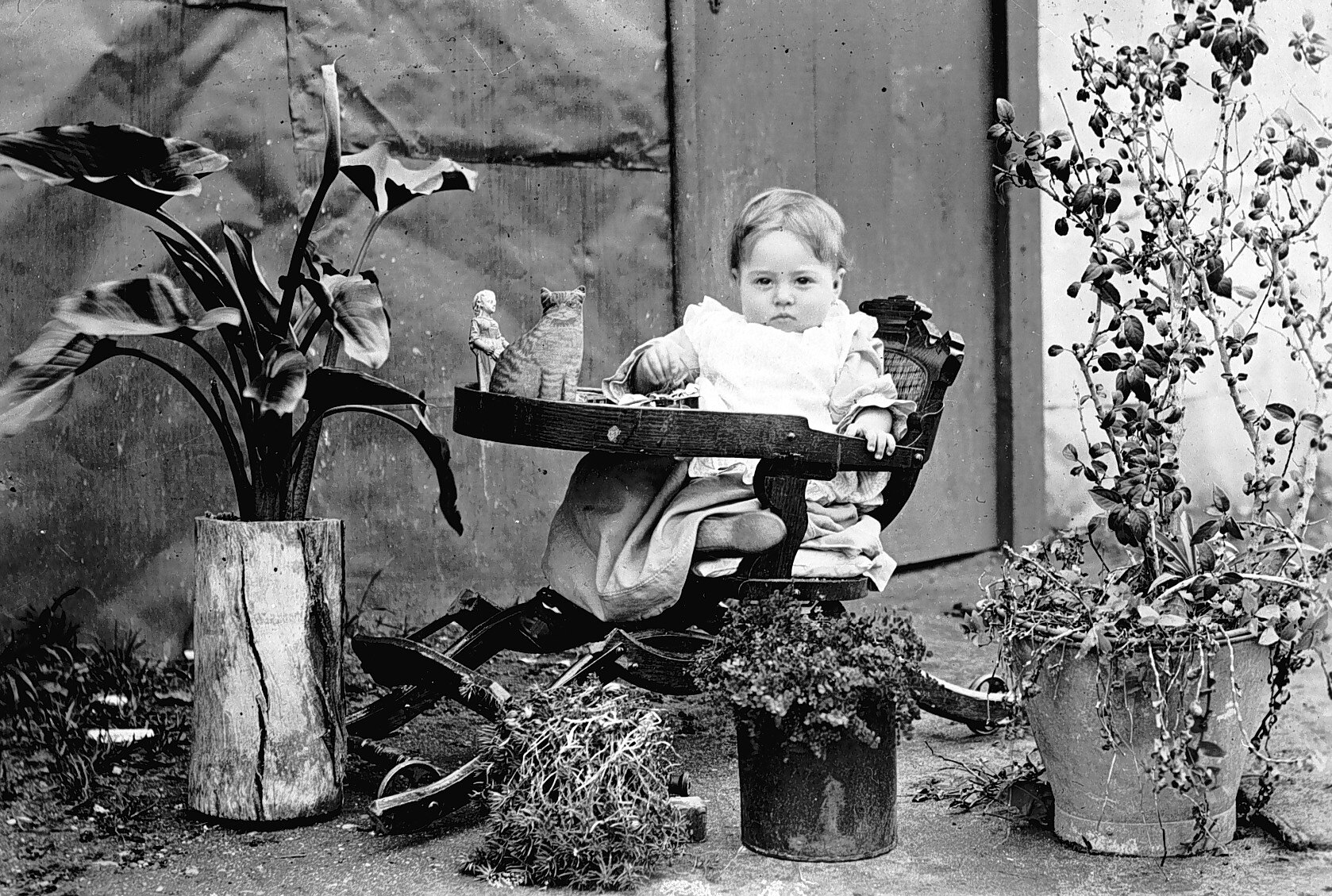A baby in a high chair with his (?) Toys on the tray. The chair appears to be adjustable in height. There are a number of pot plants around the chair.