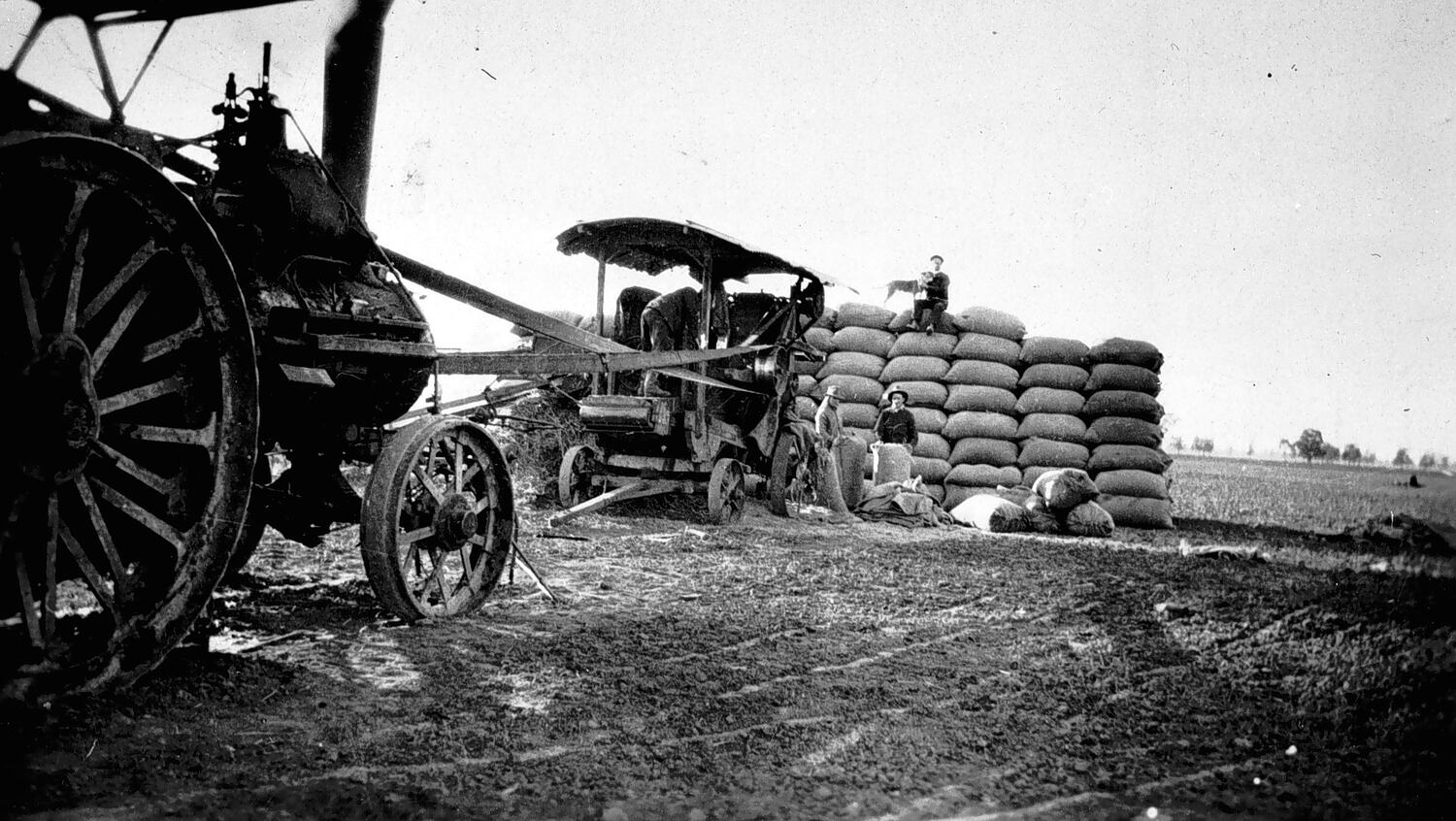 Threshing with a Foden traction engine. There is a small stack of grain sacks in the background.