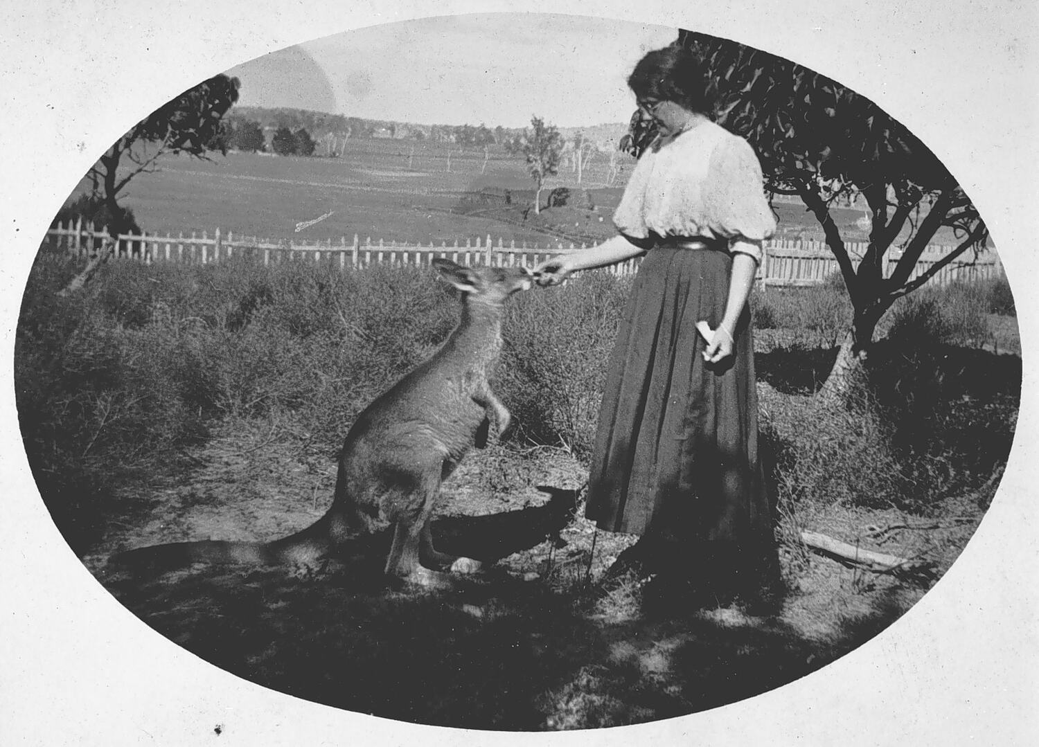 A woman feeding a kangaroo on 'Fostervale' farm.