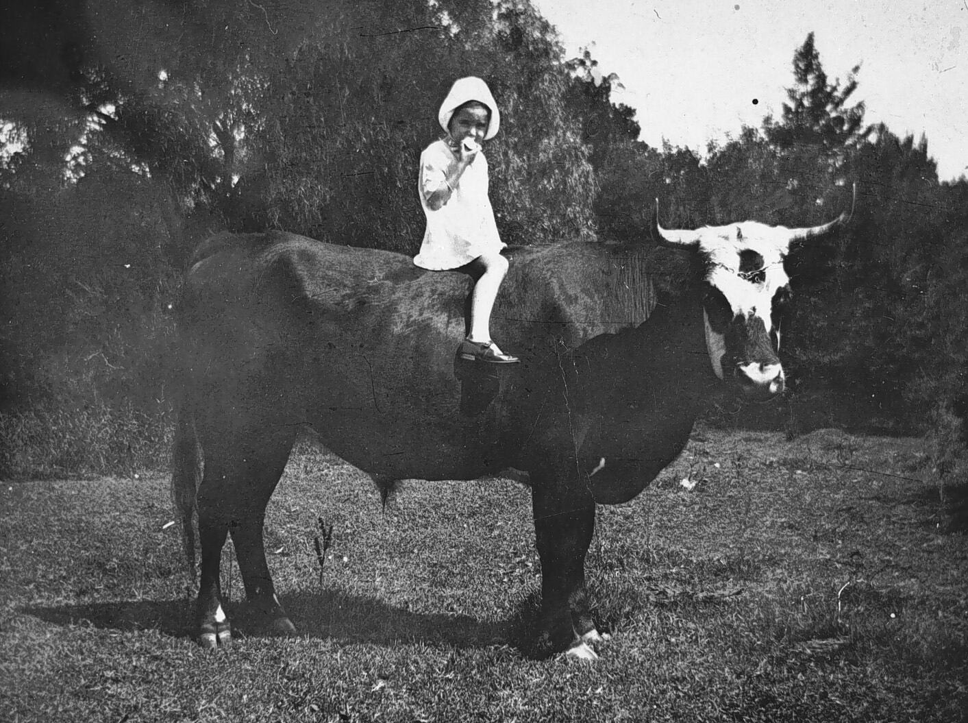A small girl on the back of a bullock on 'Fostervale' farm. The girl appears to be eating an apple.