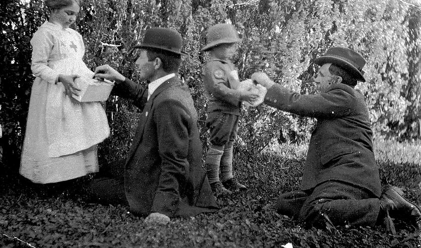 A small boy and girl collecting money for the red cross from two men are seated on the ground.