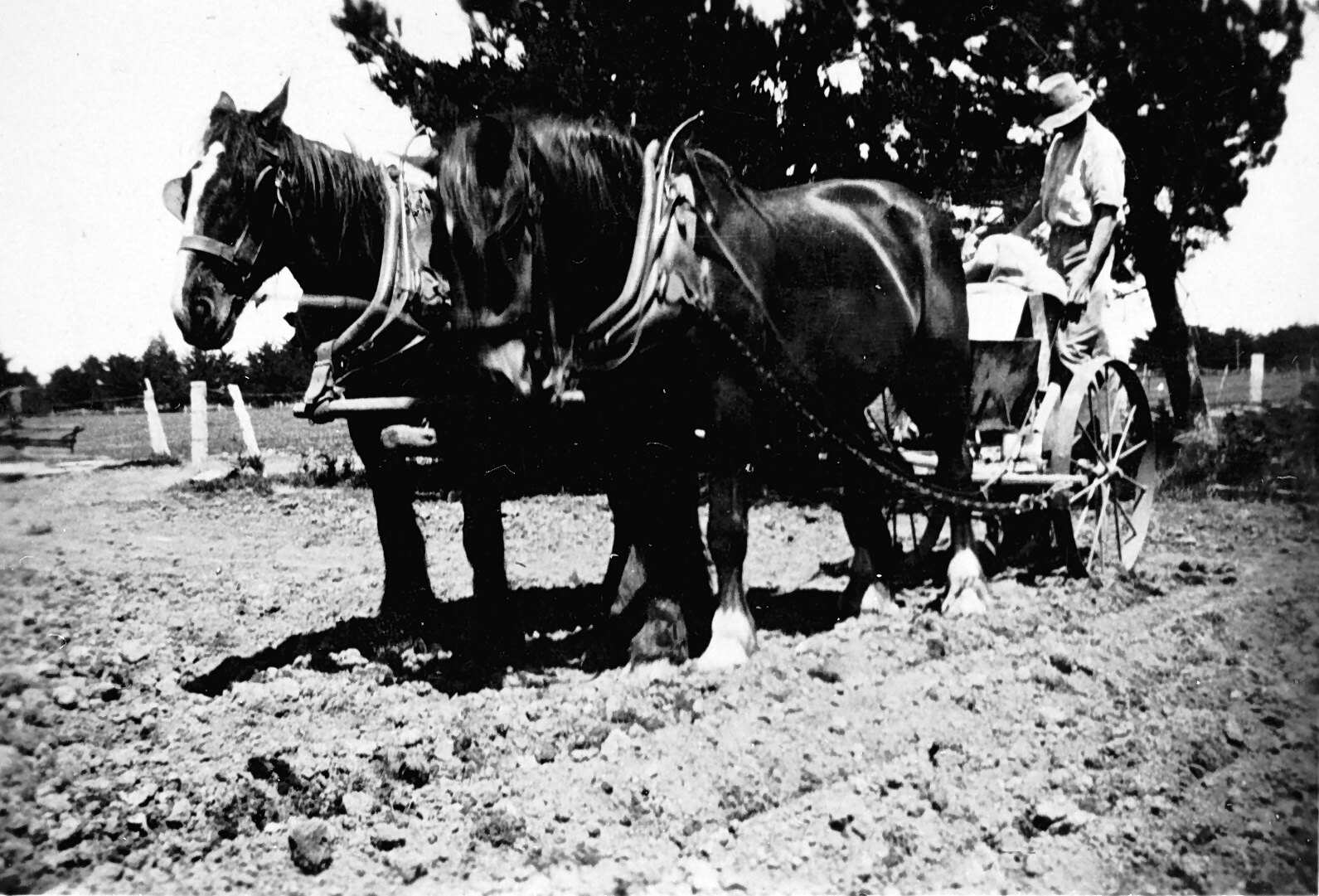 A man sowing potatoes. His seed drill is drawn by two horses.