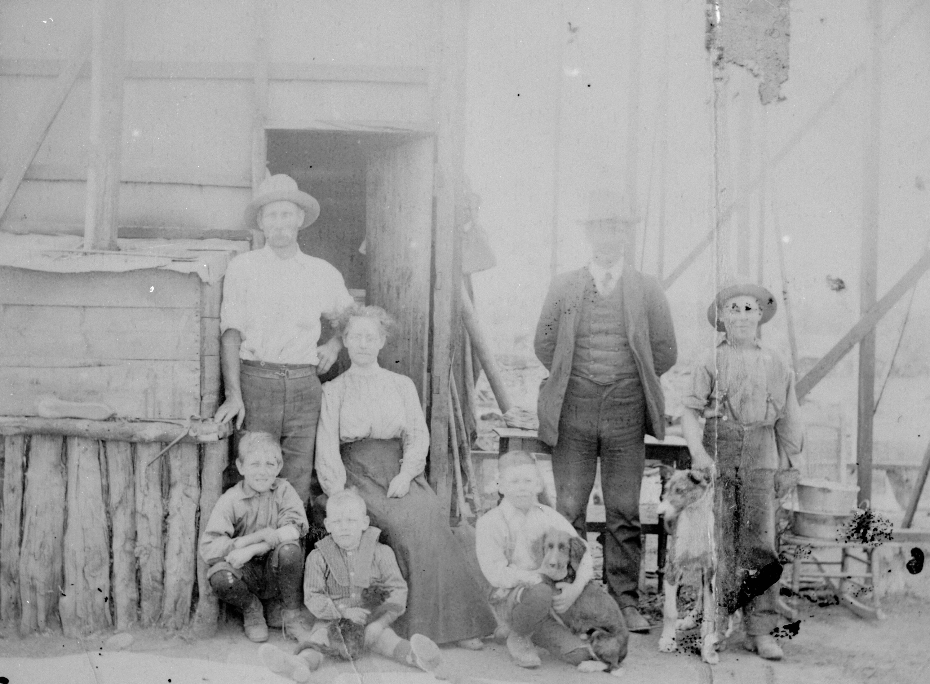 Black and white negative of a family posing out the front of their new home, Merbein South, Victoria, 1911.