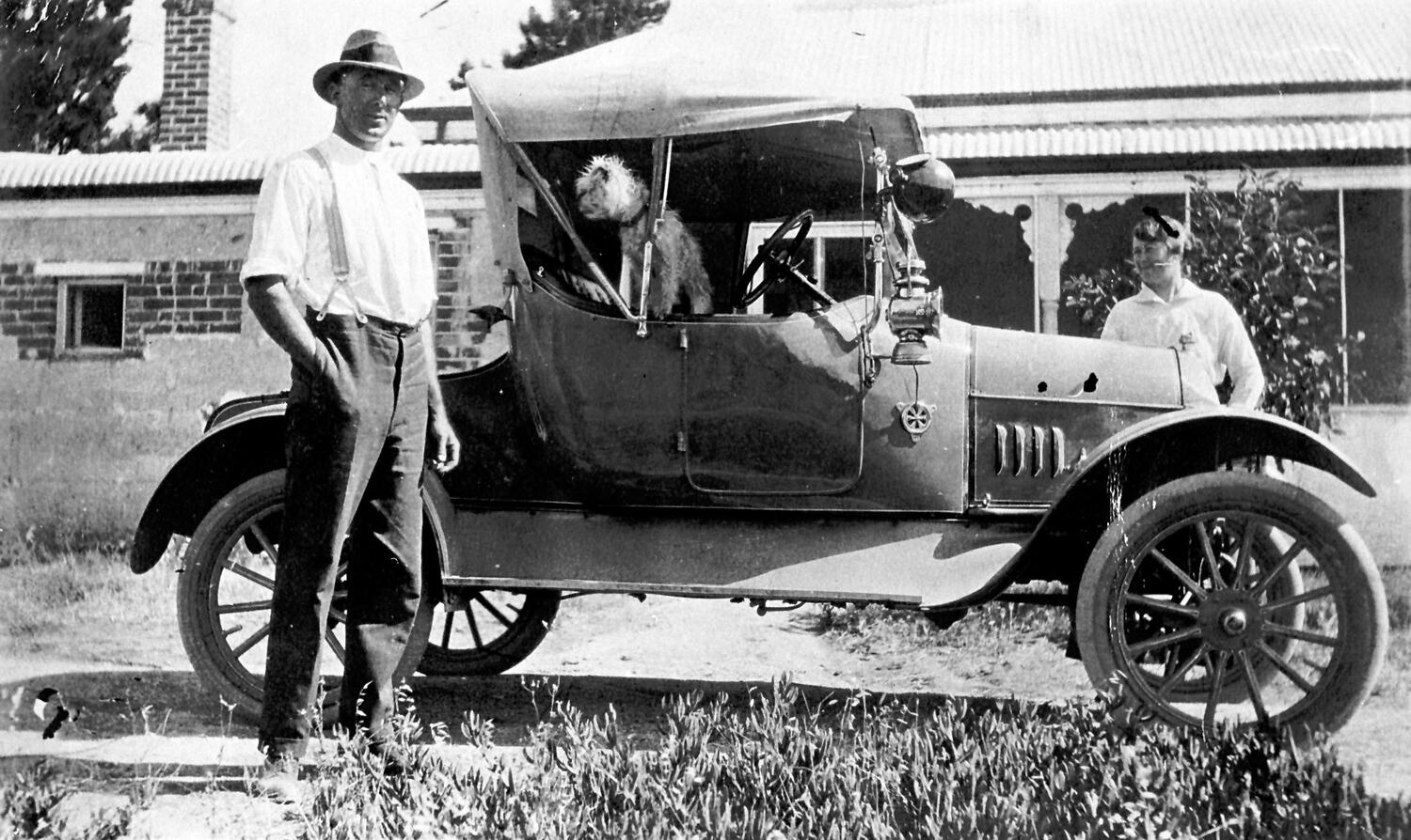A man and woman with their Model T Ford car. There is a dog in the window of the car. Their property, 'Stretton' is in the background.