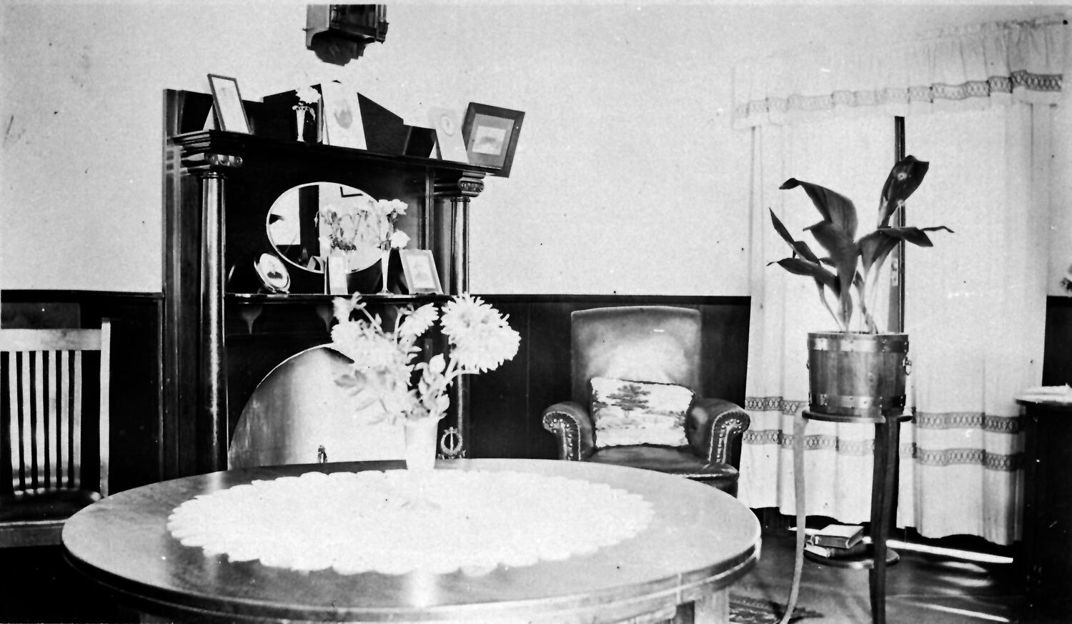 The lounge/dining room of 'Stretton' on block 54. There is a circular table in the foreground, an elaborate fireplace in the background and an aspidistra on a stand on the right.