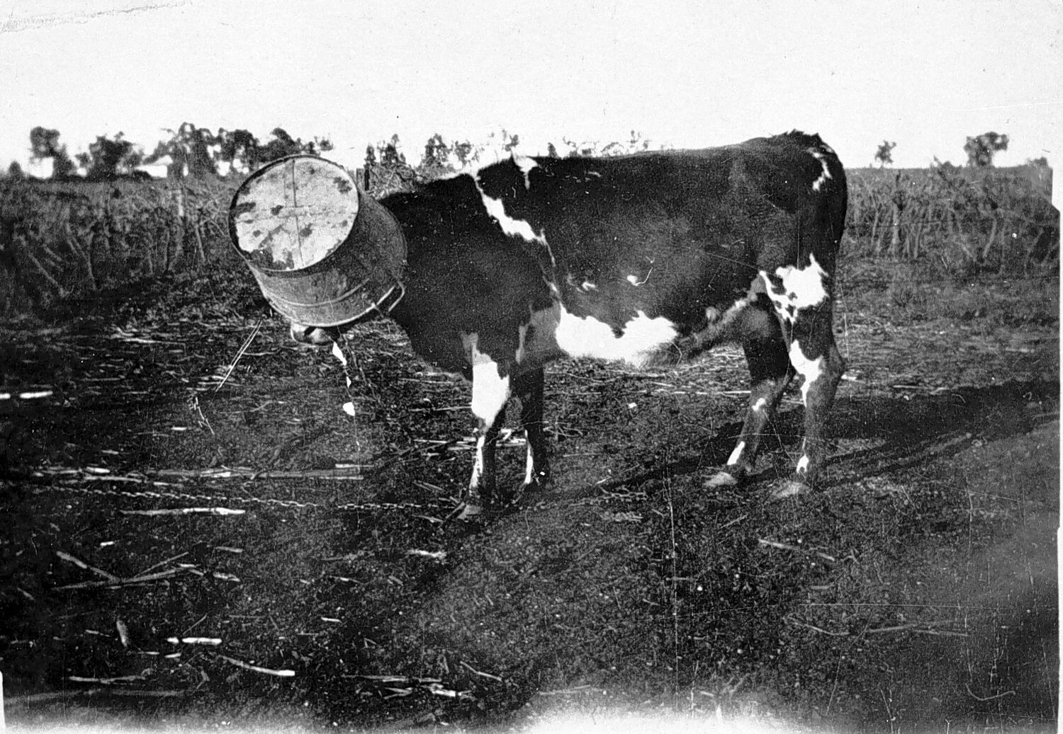 'Betty' the house cow, owned by the Wescombe family on Block 562, Cardross. Dorothy Wescombe remembers that 'Betty' would always put a bucket on her head when it was about to rain.