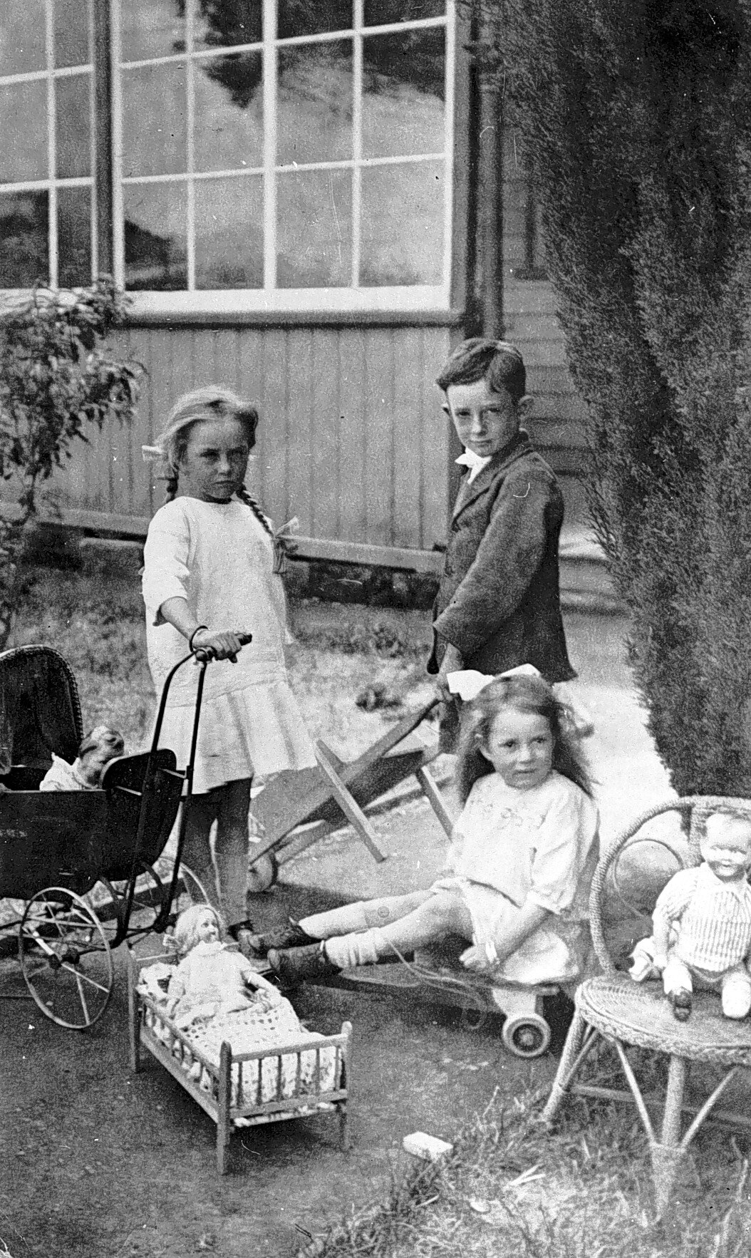 A boy and two small girls with their toys.