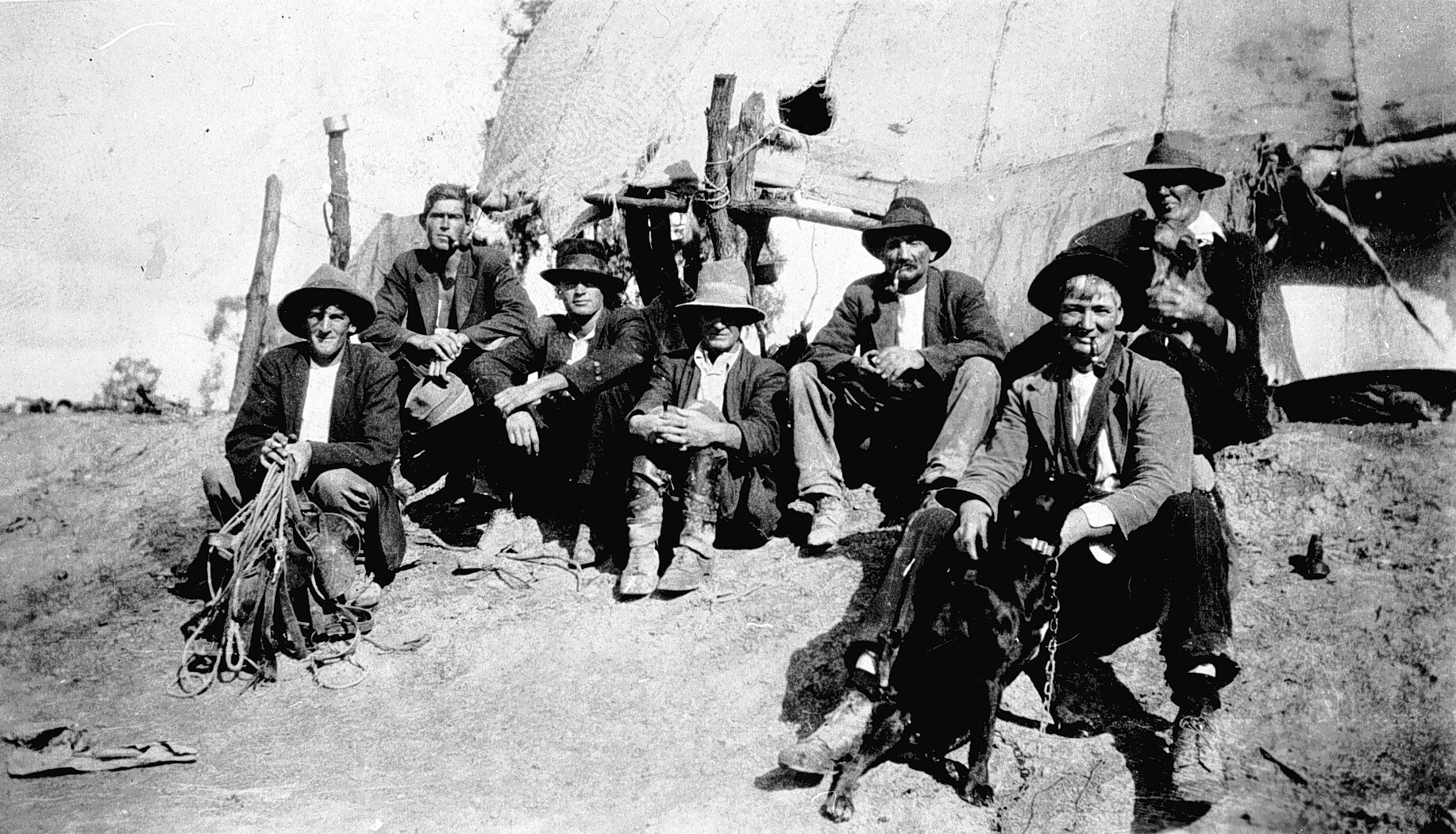Bridge construction workers seated in front of a tent. The man on the right holds a dog.
