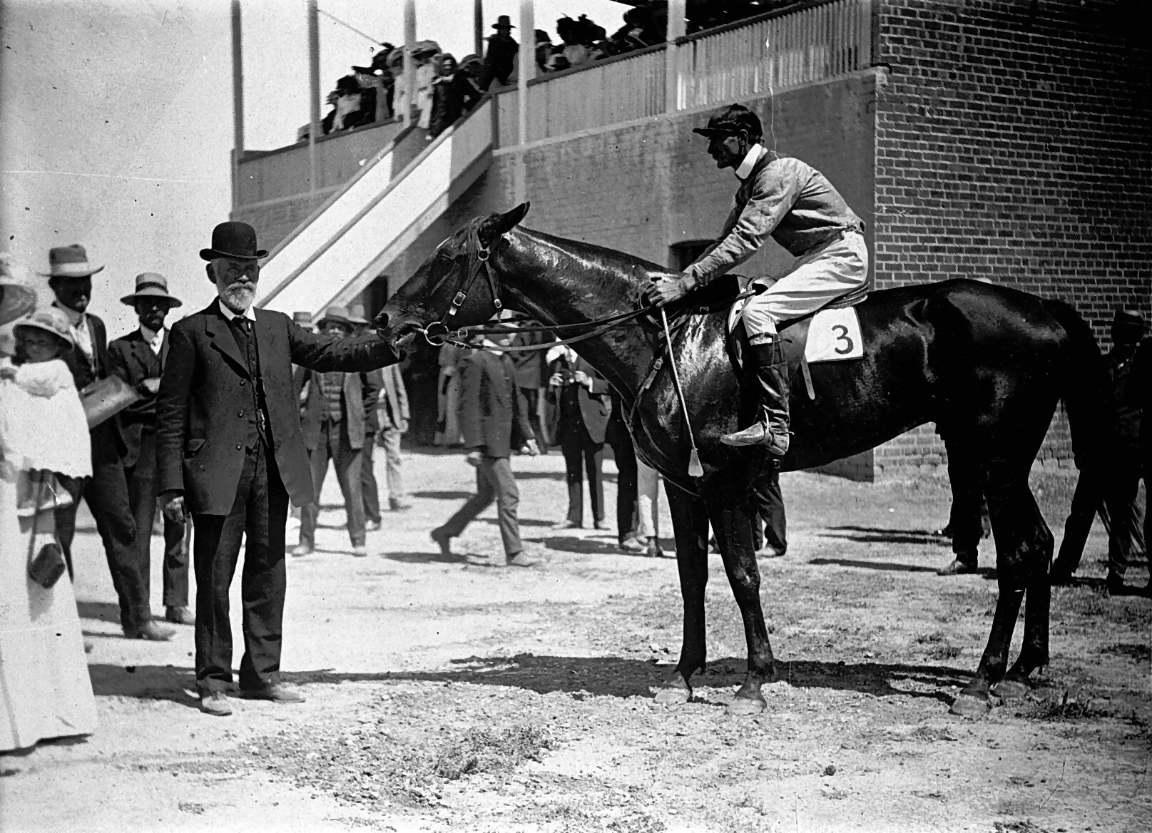 A racehorse with its jockey and its owner. There is a grandstand in the background.