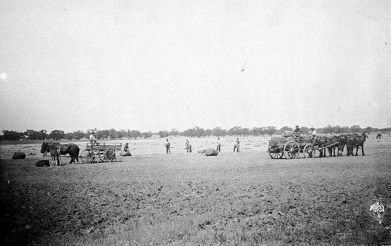 Drying wool bales which have been recovered from the sunken barge 'Florence Annie'. The bales have been placed on the ground and there are two horse- drawn carts. The property is 'Balcatherine' station.