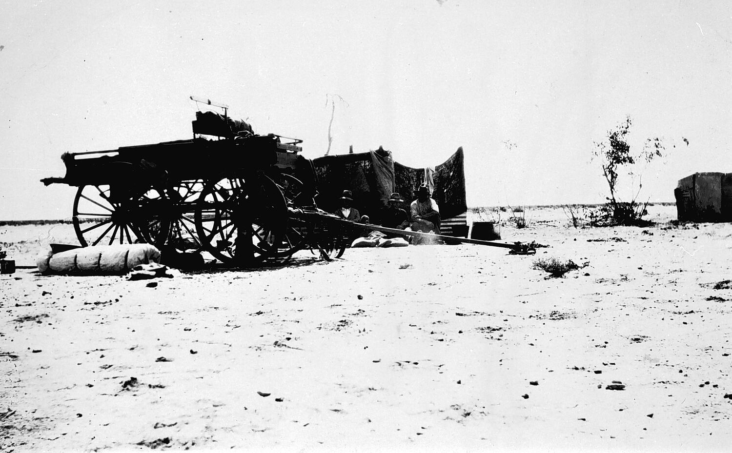 Drovers resting in a hessian shelter. They were part of Reg. Pedler 's droving caravan.