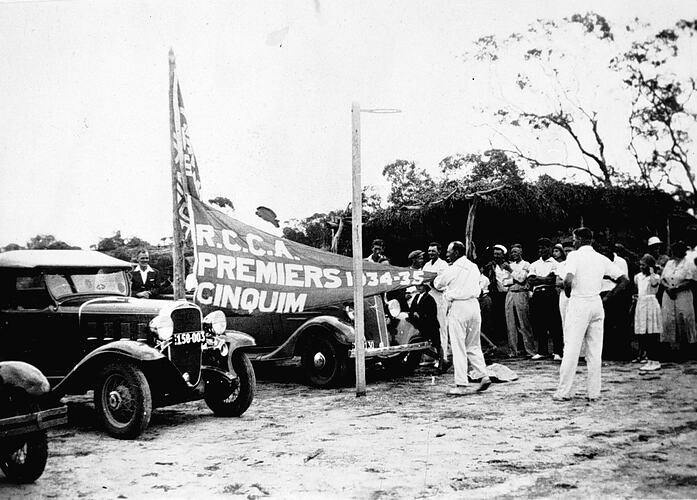 The captain of the Ginquim Cricket Club making a speech as the premiership flag is raised. There are cars on the left, a pole and netball ring in the foreground and a bush bough shelter (used as clubrooms) in the background.