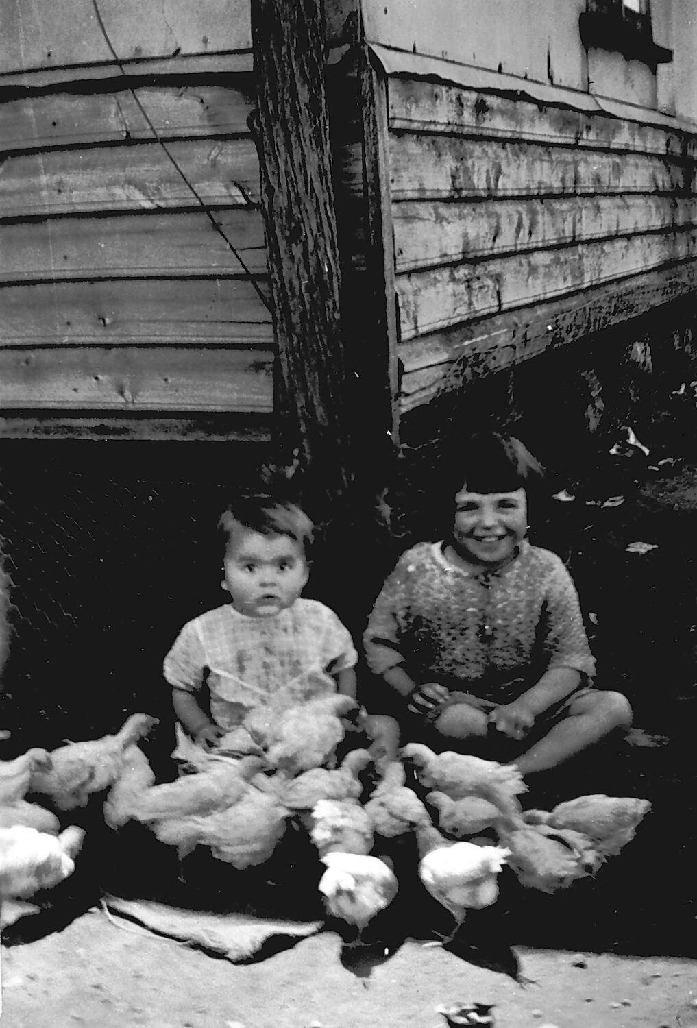 Two small girls feeding chickens. The house had five rows of weatherboards and then cement sheeting. The pine pole held the telephone wire. Chicken wire around the house kept children, animals and rubbish from beneath the house.