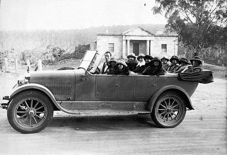 This image is of ten women being driven in a large automobile by a male driver in rural New South Wales in the mid 1920s.