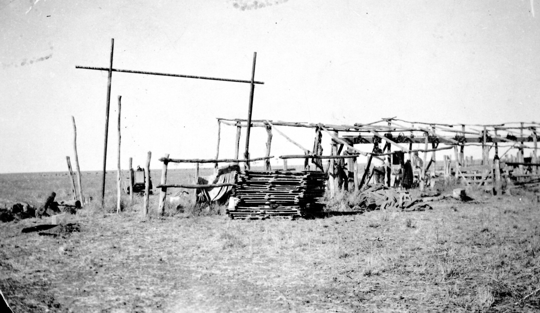 A skeleton shearing shed on 'Nottingham Downs' station. The shed consists of a framework and has no sides or roof. It was covered and fitted out before shearing commenced.