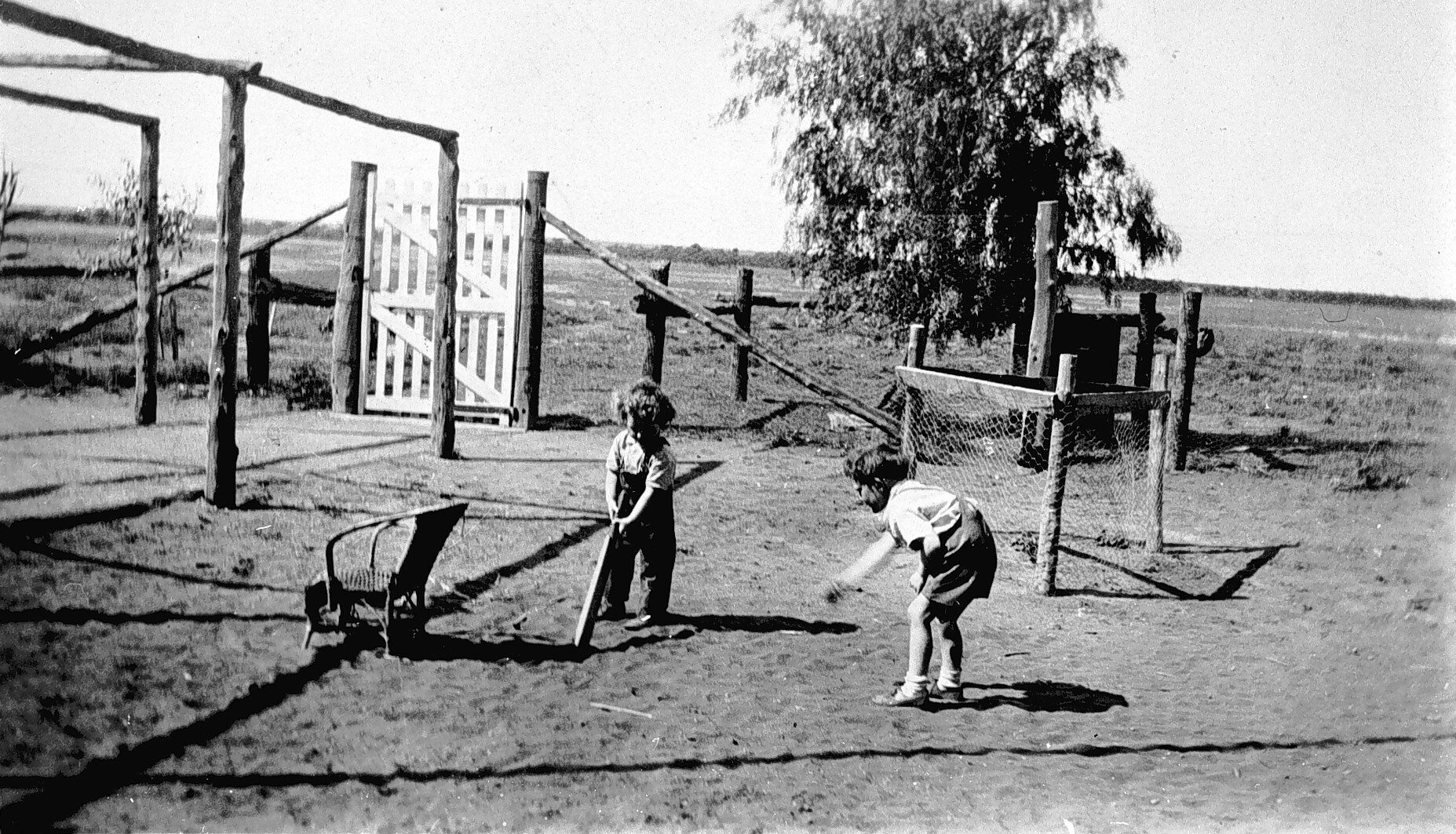 Two small children playing cricket in the farmyard at 'Wamberra' station. They are using a chair as wicket.