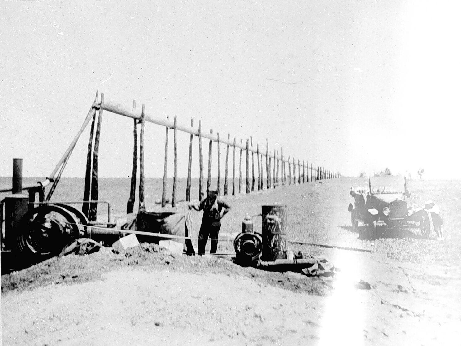 Pumping water from a dam to the farmhouse on 'Sunny Hill' farm. The pump is pumping water along a viaduct of logs.