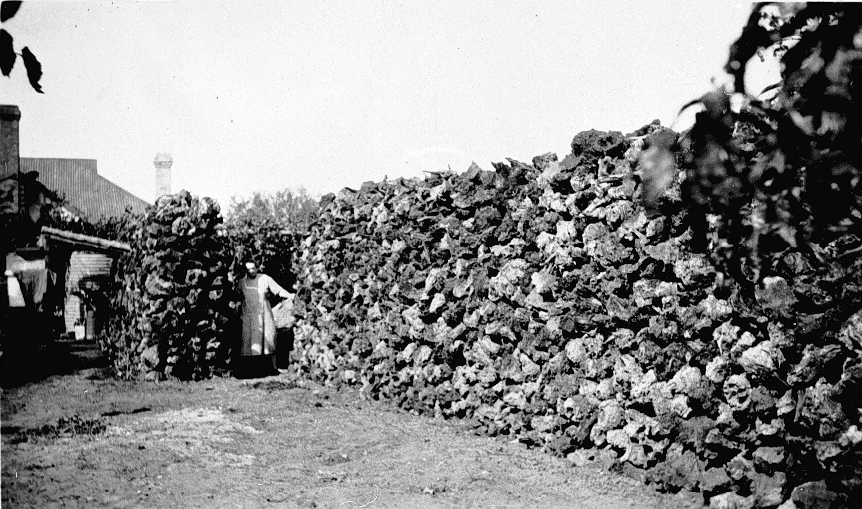 A woman standing by a wall of Mallee roots on 'Sunny Hill' farm.