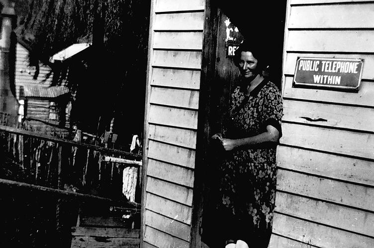 A woman in the doorway of the post office in Lower Gellibrand. There is a sign: Public Telephone Within.