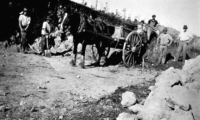 A road gang with a horse and cart. This was a road construction gang run by Hope Wilson.