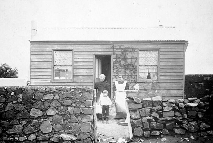 Two women and a small boy in front of a small wooden house. One woman holds a pole on which a cockatoo is sitting. There is a dry stone wall in front of the house.
