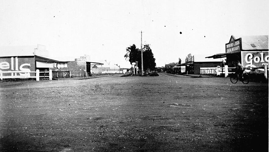 The main street in Yenda. There is a general store on the right and a plantation down the middle of the street.