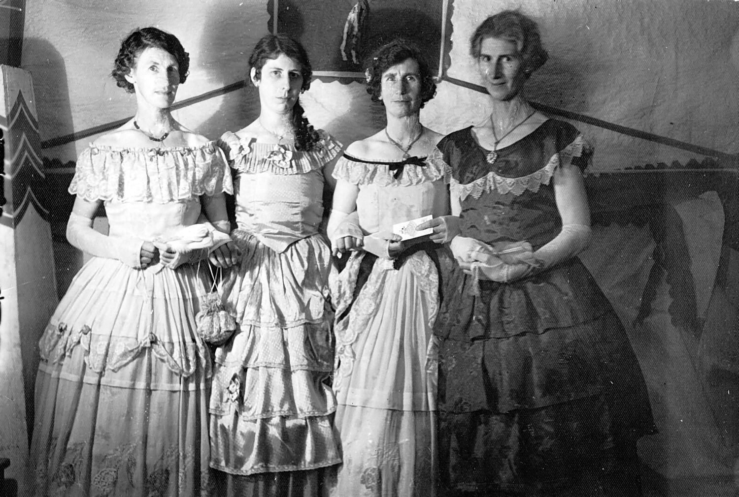 Female members of a Gippsland family attending a pioneer ball. They are wearing off the shoulder crinoline gowns, fingerless gloves and holding dance cards or bags.