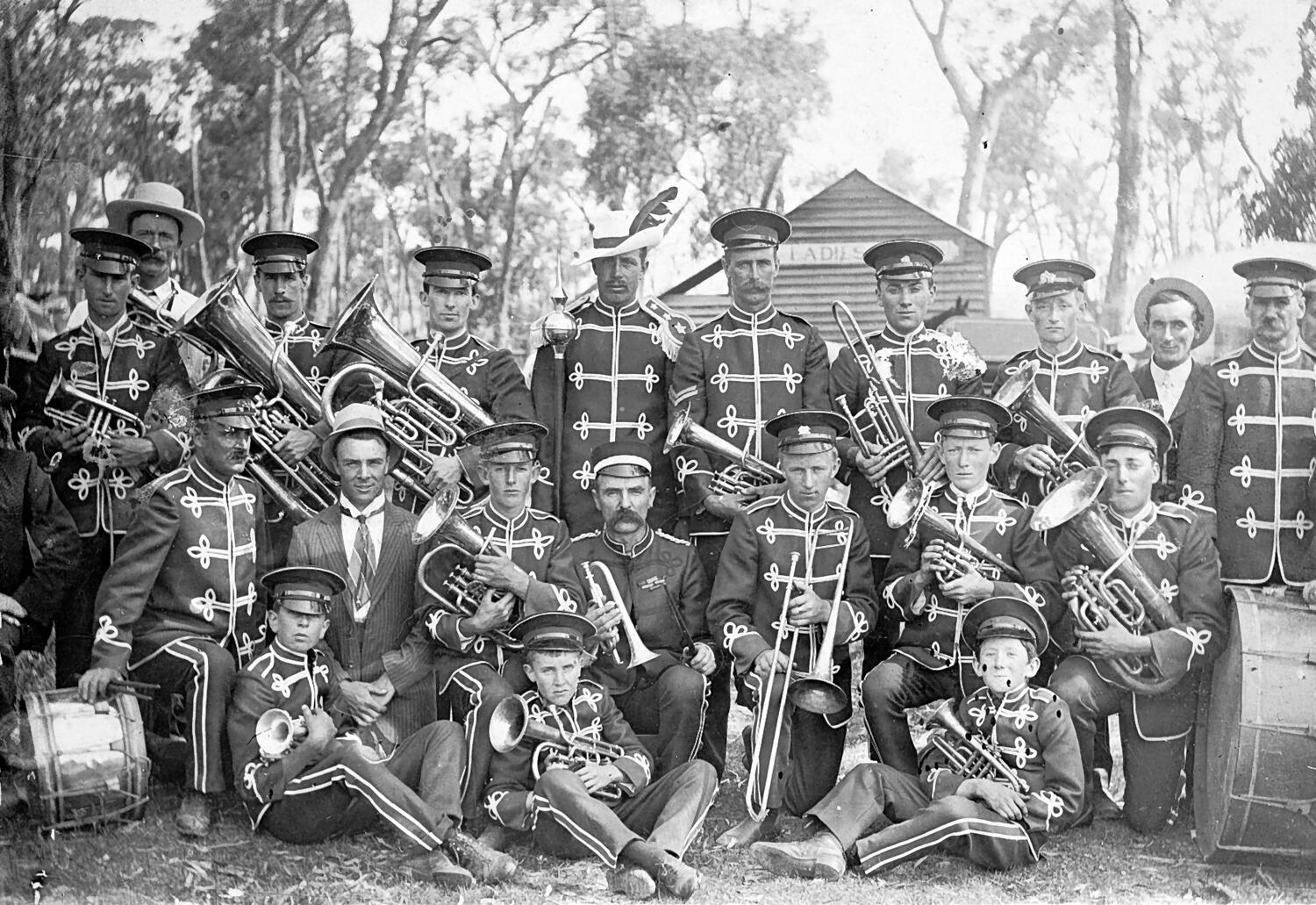 The Warragul Brass Band. They are, presumably, at a sporting oval or picnic ground as there is ladies toilet visible behind them.