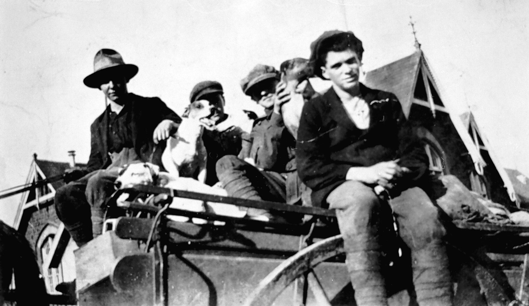 A group of boys and dogs going rabbiting. They are sitting in horse-drawn cart.
