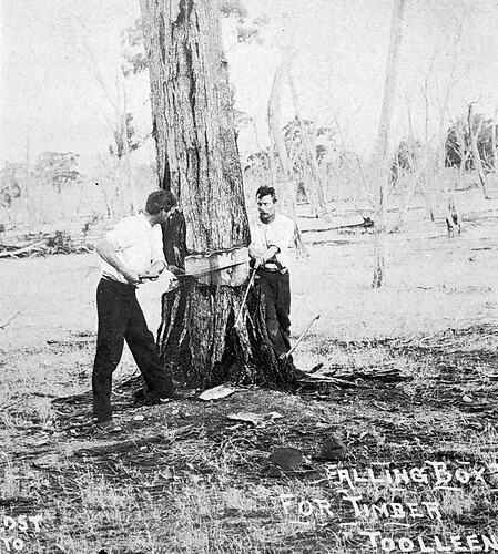Printed at lower right of photograph: FALLING BOX / FOR TIMBER / TOOLLEEN