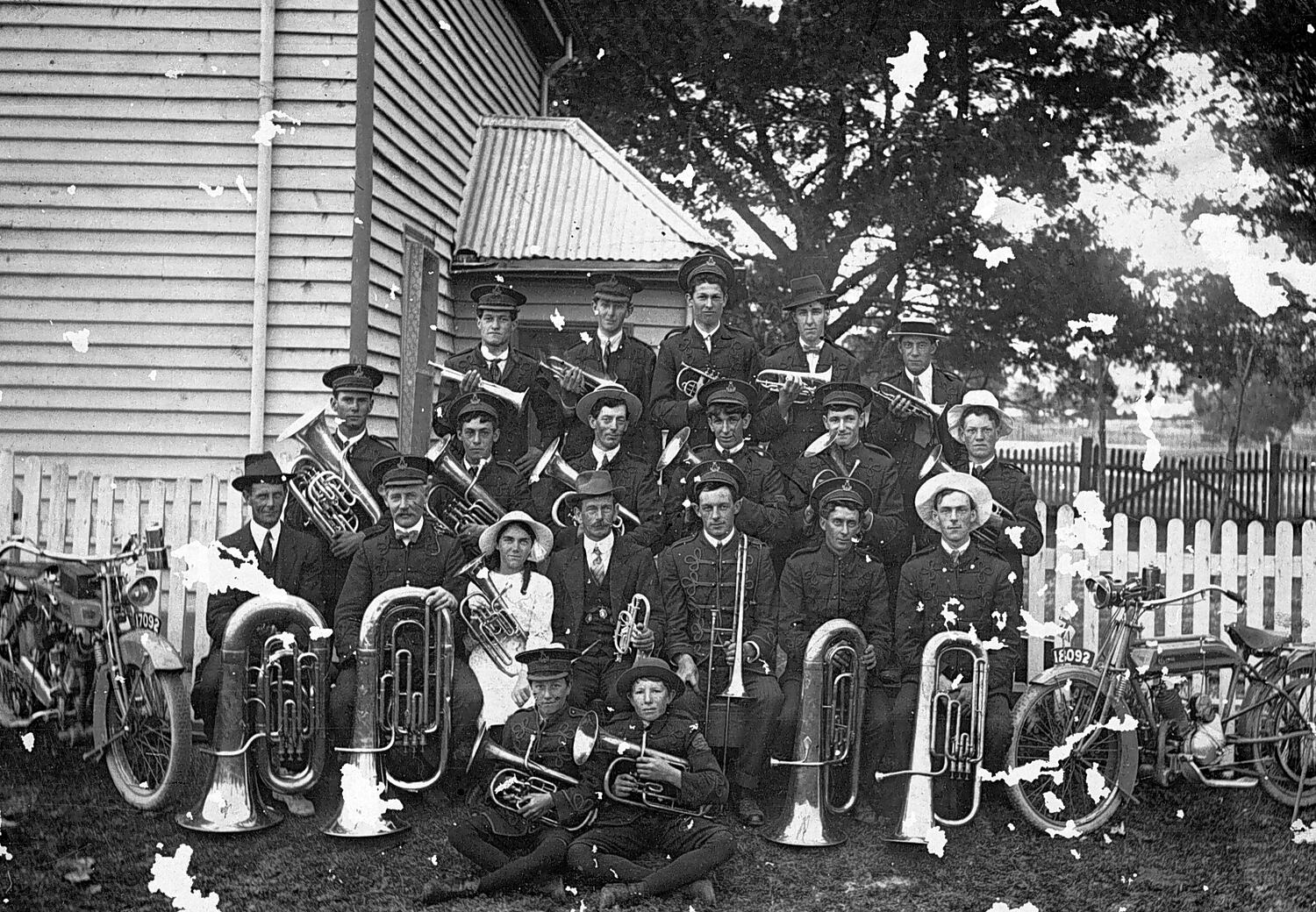 Traralgon Brass Band in about 1915. Bandmaster Mr J.T. 'Tom' Tansey is seated in the centre holding a cornet. Sitting to his right (viewer's left) is his daughter, Miss Hilda Tansey. A motor bike is parked on each side of the group. The Euphonium player, second back row, far left is Leslie C Davidson. He became Drum Major of the Band prior to his death in 1960.