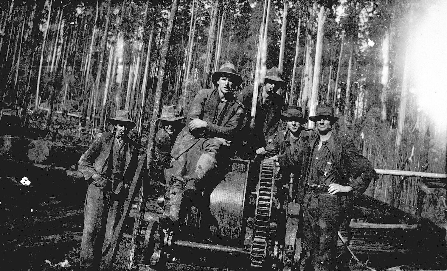 Sawmill workers with a piece of machinery in a forest setting.